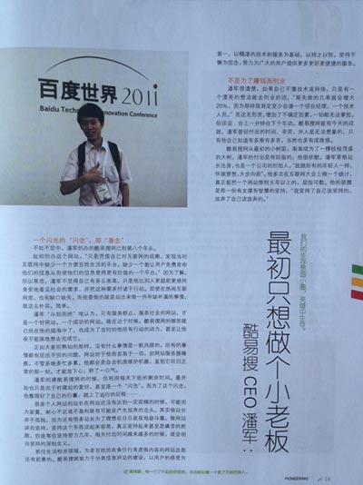 酷易搜分类信息网 从最初的小树苗,渐渐成为了一棵枝桠茂盛的大树,潘军的付出是有回报的,他很欣慰。潘军是一个草根站长出身的,也是一个公司的创始人,“我跟所有的年轻人一样,怀揣梦想,大步向前”。他多次在互联网大会上做一个统计,真正能把一个网站做到5年以上的,屈指可数。他的骄傲是那一份有支撑有智慧的坚持,“我坚持了自己该坚持的,放弃了自己该放弃的。”