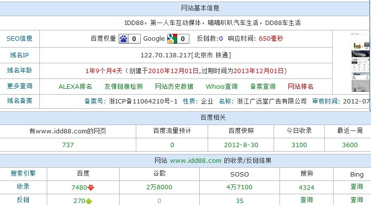 昨天有幸加入了浙江站长群,在里面听到一位站长在那诉苦,为什么自己的网站建站将近2年的时间,为何百度权重为0,谷歌PR为0,当时我粗略的看了一些,确实存在不妥的地方,今天刚好有时间,我将对这个老站,做一个深度的解析(高高手可以飘过) 首先我们来看下,这个网站在站长之家的综合查询 大家可以从上图看到一些关于这个网站的基本信息