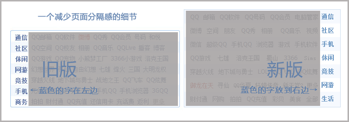 旧版腾讯服务,蓝色文字列表在左边,而新版没有直接那样做,将它改动到了右边。很少有设计会把归类文字放在右边,一般都是放在左边。可见是经过设计师的一番用心的。如果放在左边,对于全局而言,就会感到页面被一条蓝色给分了,分隔感增强,整体感减弱。很喜欢设计师的这个用心哈。