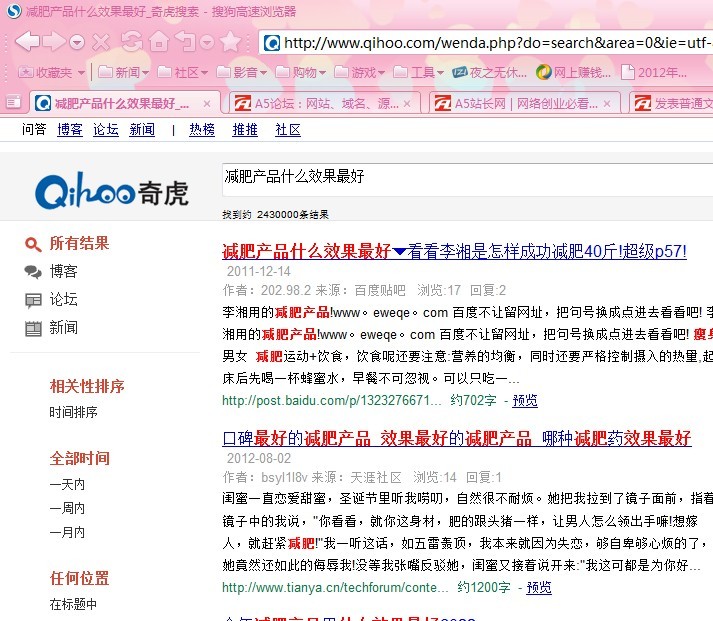 上面是360搜索的独立域名所展现出来的首页,现在我们开始点击左上角的问答看看,然后输入《减肥产品什么效果最好》。