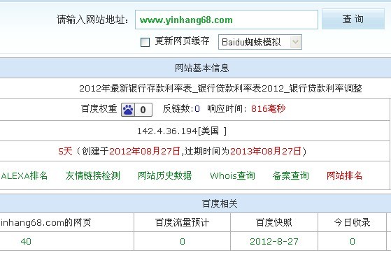 大家可以清晰的看到这些标签成空格有序的排列在一起,你服不服,即使你不服我都服了。这个网站能够在当天上线就被立即收录看来是有很多原因,总结下来就是以下几点: 1、栏目清晰明了,无多余杂质,这是吸引蜘蛛的前提条件。 2、内容紧扣网站主题,是什么就是什么,没有多余的内容。 3、网站上线之前准备充分,程序、空间、内容早已准备好。 4、网站地图、TAG标签很完善,值得我们学习。 分析了这个网站再与我的网站进行对比,我都感觉到有一点失败,在这里也祝愿这位站长朋友的网站运营越来越完善,也给这位站长朋友道歉,没有经过你的同意就分析了你的网站,不好意思了哈,下面帮你留下一个外链吧,权当友谊,本文来源于银行利率,希望这篇文章的分析对站长朋友有很多帮助,也不枉我写了2个多小时。 (责任编辑:admin) |
