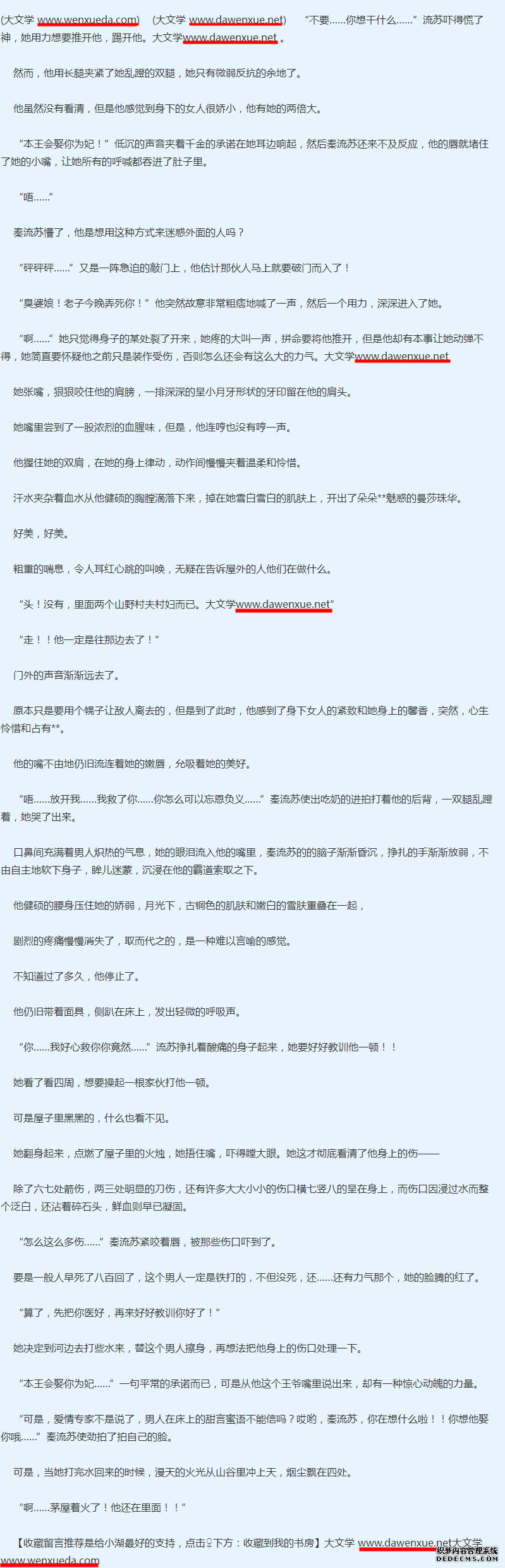 此外,该网站的外链数量达到了惊人的将近十万的数目,也就是一天要一万条,我们来看看都是从哪里导向来的呢?经过分析发现,它的外链几乎全部来自与其它小 说网站的内页,而导入的链接大多都是从友情链接那些高权重站点来的,这无疑让我对站群的猜测更加肯定了几分。随便打开一个反链,文章的最上方和最下方都一 个链接,而观察其它的外链,发现它的很多外链都属于这种形式,这种链接明显属于垃圾链接,为搜索引擎不齿,而且我发现不光是外链,竟然连收录的页面也是文 章首尾都加首页链接,有一个页面甚至加了7个链接。接下来当我无意中又打开一个反链,竟然找不到文章中的地址,查看源代码一看原来是被隐藏了,这种做法已 经触动了百度的黑帽算法,严重属于作弊行为了。 我相信一旦被百度察觉它的这些行为,这个网站凶多吉少,尽管有大批老站给它撑腰壮胆。