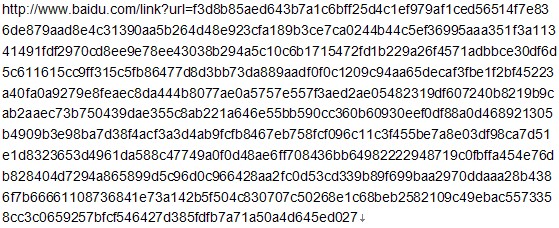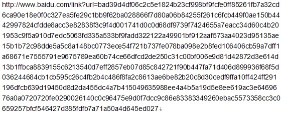 百度URL结果 上图得到的结果是一个加密的URL,URL的特点有三个:1、长;2、数字和字母组成的一段代码;3、随机生成,除特定一段字符不变(猜测应该是关键词)。大家如果感兴趣,可以清楚的看到这个URL后面的字符串是非常长的,而且每次搜索的结果展现的代码都不同,可见百度对于搜索结果进行了加密处理,下面是再一次搜索得到的结果: