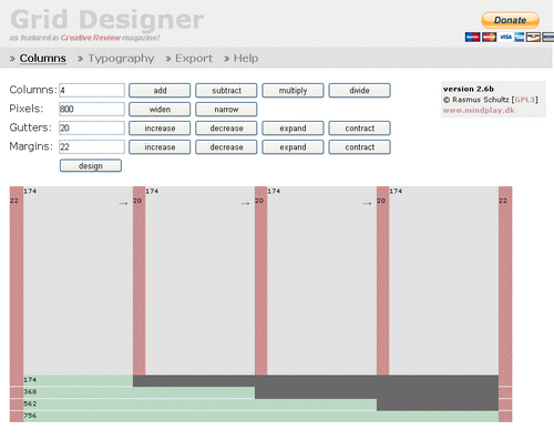 图3 注意,Logo、左侧栏、内容区、右侧栏及页脚部分的文字均为左对齐,导航及Banner图区域为居中对齐。 这仅仅是一个举例,来说明如何清晰地布局网格系统中的页面元素。 网格系统 一些网格系统及模版可以指导我们布局Web设计元素。下文列举了两个此类系统,你可以修改其中各种设置,如列、排版,并以CSS和HTML格式进行保存,从而快速提供原型,或整合入现存的开发环境中。 由Web开发者Rasmus Schultz提供的Grid Designer 是一个在线工具,它默认提供4列,宽分别为174px,总宽度为800px,其中每列间有20px的间隙,页面两侧分别有22px的留白。在该案例中,默认的排版样式为Veranda:段落内文字大小为10px,行高为1;标题采用默认字体,大小为16px,行高为2。如图4。