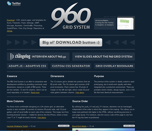 图4 960 Grid由Web设计师Nathan Smith设计,可供下载。它提供了一个系统,通过常用维度来分割宽为960px的页面来流程化Web开发。它提供了两种选择:12列和16列,每一种选择即可单独使用也可混合使用。12列网格将宽均衡地分割成12列(每列宽为60px),而16列网格则分割为16列(每列宽40px),每列左右两侧具有10px的间隙,各网格最外侧均留出20px的空白。