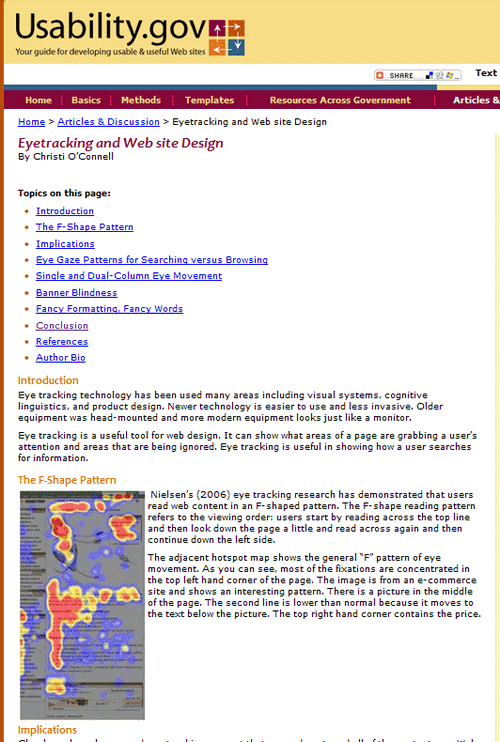 无论你是否意识到,对齐都是大部分Web设计中必不可缺少的部分;它作用于幕后,是一个隐藏设计元素。它起初可能只是一个PSD文件,也可能是设计模版中不可缺少的部分,是Web设计的主干。你的网站可能有一套布局(或网格),作为主要的框架,以支持网站的外观、体验、导航、工具栏、页眉、页脚等。 作为高效设计原则,“对齐”可以帮助我们对“元素如何在页面中布局”做出明确的决定。利用战略层上的布局,可以设计出更强大、更吸引人的作品;利用网格系统,可以为每个元素的定位提供标准的指导。没有对齐策略,我们就会随意安放元素,与其他相似元素产生很小甚至不会产生联系。没有对齐,网站的外观及体验就会变得杂乱无章。 对齐策略已远远超越了对齐、浮动属性及文本和图片的对齐方式,它还包含其他的因素,比如用户的交互、信息架构、网格及Web设计元素的组织。 关于Web设计中的对齐,你是如何做决策的? 最主要的考虑因素包括对典型用户交互方式的分析,如眼动追踪测试。针对“用户如何浏览网页”的多项研究已开展,内容包含眼睛是如何浏览页面的,从开头到结束的扫描路径是什么,用户如何决定跳转到的位置及下次点击位置等。Charles O’Connell在Usability.gov上发起的讨论(如图1)介绍了眼动追踪测试的含义。从这些研究可以看出,它的要点之一是大部分用户会沿着“F”形状的“热点图”来扫描页面内容,即从顶部开始(正如头条往往比图片更吸引眼球),仅扫描几个词后,便沿页面的左侧扫描并寻找更多有吸引力的内容,并在几秒内做出点击动作。