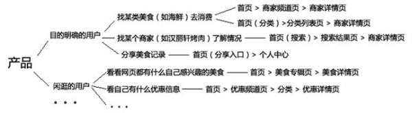 (这边重点介绍设计模型,对于里面的分类方法是否有优化空间这里不做特别的探讨) 在设计时,我们综合考虑这两种用户,并从中选择几个最强的场景,如找美食、商家,这样就需要有清晰的商家聚合页及美食聚合页。 现在,“需要哪些页面以及这些页面之间的关系”已经非常清楚了,我们就可以产出如下产品架构图: