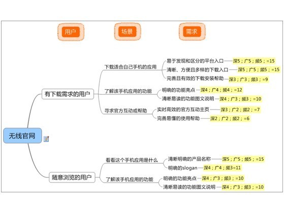 以百度XX产品APP官网为例,引用此模型则可以导出以下思维图: