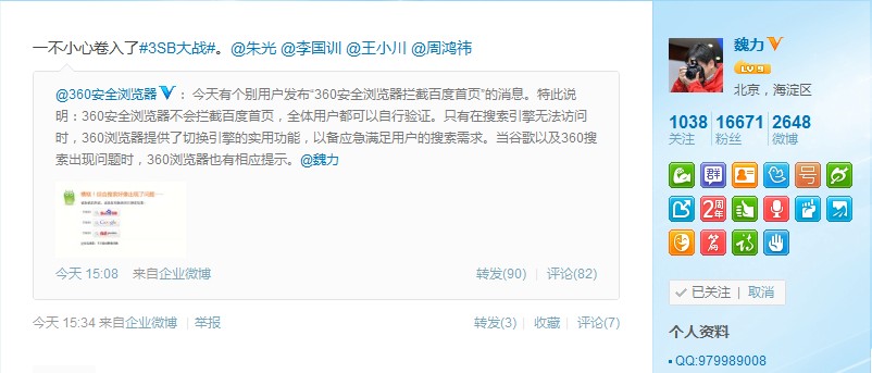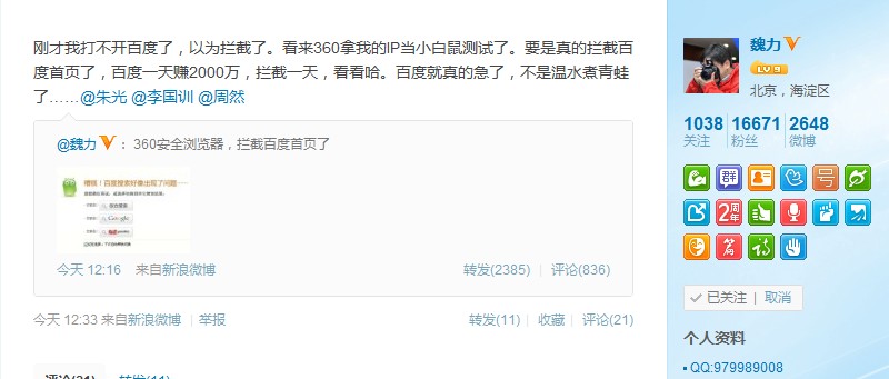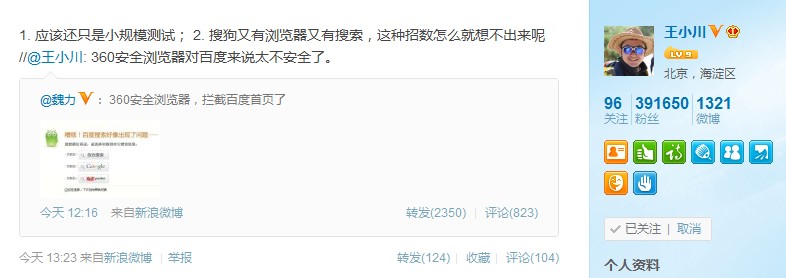 王小川微博(站长网配图) 事件回顾: 9月5日中午,TechWeb副主编魏力在新浪微博发布了一则消息并截图称360安全浏览器拦截百度首页。随后此条消息被广为转发,360安全浏览器恶意拦截百度首页的首发也在互联网迅速传开。搜狐CTO、搜狗CEO王小川更是在微博上称360安全浏览器对百度来说太不安全了,并调侃应该还只是小规模测试; 搜狗又有浏览器又有搜索,这种招数怎么就想不出来呢?“3SB”大战正酣,而一场针对360安全浏览器是否拦截百度首页的讨论也迅速成为热门话题。 8月下旬,一向不按常理出牌的奇虎360突然宣布进军搜索领域,推出360综合搜索,并正式启用独立域名(360sou.com和360so.com)。一场百度与360之间的搜索大战正式开始,而随后搜狗也不甘示弱,加入到“3B”大战之中,升级为“3SB”大战。大战开始后,双方你来我往,小动作不断,而360此前在“3Q”大战以及与金山等对手的大战中,也有过拦截竞争对手产品的嫌疑,在这场搜索大战中,违反Robots协议的行为更是遭来非议,因此来自竞争对手和业内旁观者的质疑一直不断。这场搜索大战究竟会如何发展,目前尚不明朗。(文/扬扬) (责任编辑:admin) |