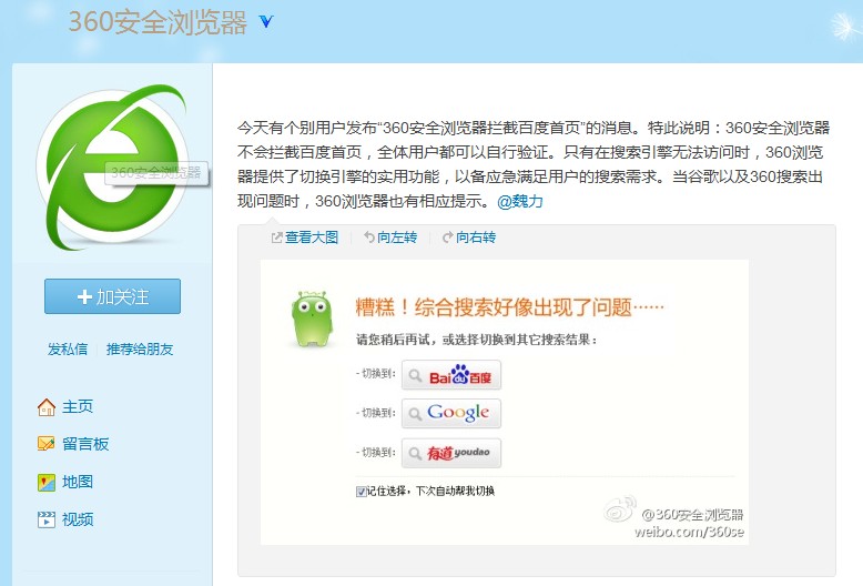 A5站长网9月5日消息:今日下午360安全浏览器发布声明称有个别用户发布“360安全浏览器拦截百度首页”的消息。特此说明:360安全浏览器不会拦截百度首页,全体用户都可以自行验证。只有在搜索引擎无法访问时,360浏览器提供了切换引擎的实用功能,以备应急满足用户的搜索需求。当谷歌以及360搜索出现问题时,360浏览器也有相应提示。