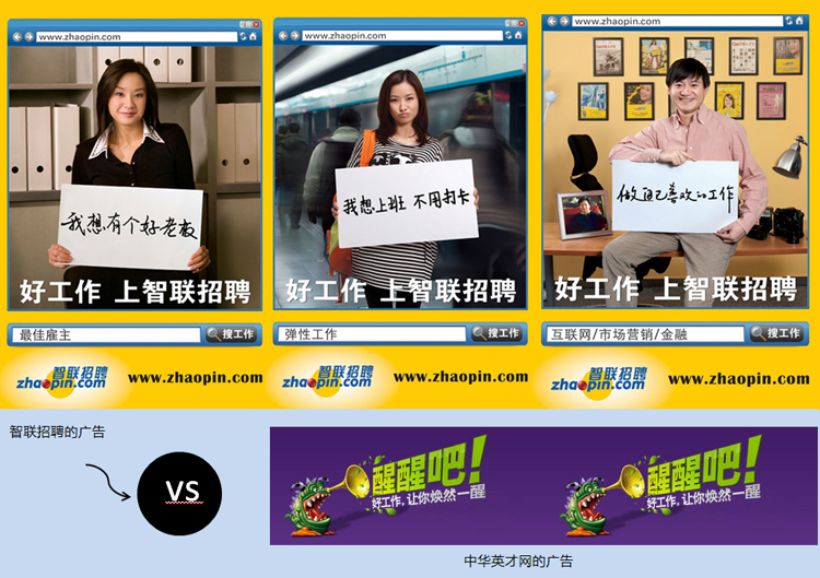 4、 两个招聘网站广告的例子 年后招聘网站宣传力度都相当大,印象最深的是下面两个例子: 智联招聘的广告采用不同的角色,每个角色一句话表明自己的求职诉求,非常有亲和力和共鸣,因为你可以在这些角色当中找到自己。比如我就会忍不住去搜索下弹性工作的企业有哪些…… 而中华英才网的广告并没有形成系列,只是通过强烈的对比色、大幅的文案的视觉冲击来试图吸引读者,二者无论在品牌传达上还是设计表达上都相差甚远…