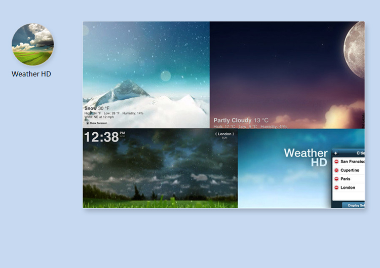 3、Weather HD Weather HD是一款非常受欢迎的iOS应用,能够使用iPad或iPhone作为视窗来进入美丽的气象环境,让用户感受被自然包围的感觉。 原因是该应用采用全屏动画来向用户展示天气,而不是像其它天气应用只以数字与小图标来进行表示。在明确气象信息的前提下设计动态天气给予用户更强的视觉冲击,从而更真实的还原当前的气候环境。模拟真实的大自然场景,做动态天气,来为用户营造愉悦的产品体验。