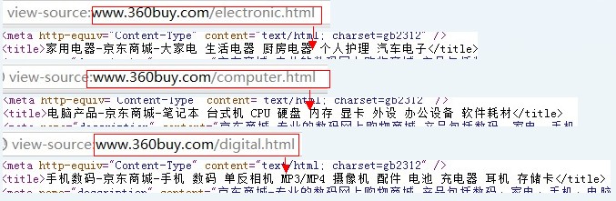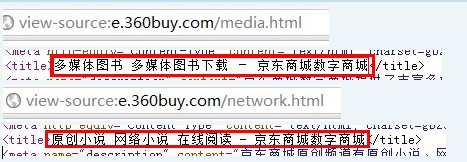 你可以对比一下就明白,京东的首页title中突出的是京东这个品牌,而之后的文字都是为了突出京东的服务特性,具有描述京东这个综合商城的特色作用;而在当当中你可以看到在首页中突出的很多产品类关键字,同样也属于商城,在首页的对待中都是不同的,一个是品牌,一个是产品;一个是服务,一个还是产品。 二级域名的title设置 - 产品为主 下面笔者列举几个二级域名的title让大家看一下京东发展下的二级域名的title的设置,如图: