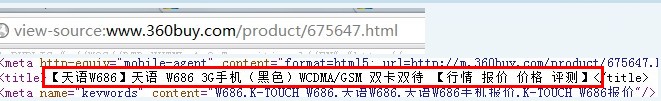 在这张图中,我们再一次的看到”行情 报价 价格 评测“,这四个主心关键字,这被笔者称之为基础组合关键字,而在前面部分”【天语W686】天语 W686 3G手机(黑色)WCDMA/GSM 双卡双待“,这些都是这款手机最主要的参数设置,从这个设置方法中,也可以看出来,一般产品页面的title设置中进可能写全,然后学习京东将各种有可能匹配到的关键字添加进去,从而获得可能有的流量导入,下面截取当当网的一款手机title作为对比