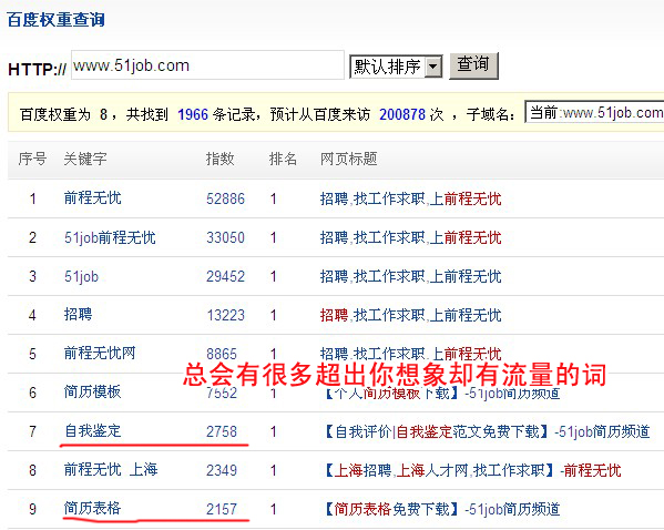 上面这个方法很适合刚上线的网站对于网站关键词的确定,当然也适合上线网站对网站关键词的扩展。而对于已经上线的网站,还有一个很好的方法,就是利用统计工具,查看长尾关键词。把有流量进来的关键词查询一下,当然由于关键词太多,需要自己筛选。有时候,可能一个关键词每天只给你带来几十的流量,但是如果你查询的时候,发现你只排在了第十位。既然第十位都能有几十的流量,那假如做到第一的话,流量最少也有两三百了,也可以查询指数大概估算一下,虽然不是很准,也可以作为一个参考。