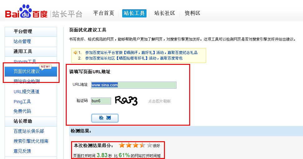 如何让百度爱上你的网站!? 相信这个问题一直困扰了很多站长。各位站长也是对这个问题有着各自独立的见解。毕竟做网站要的就是“不跟随”! 大家在做SEO的时候,一定有这样的一个意识,做站一定要对搜索引擎友好,尤其是在中国!作为个人站长,一定要对百度好!这样百度才能给你意外的收货。 广大站长在做搜索引擎友好度的时候有以下几点共鸣之处: 1、网站新颖,但不走偏门 2、尽量回避flash 3、慎用JS代码 4、做好网站地图 5、网站内链、外链建设追求高质量,完整,简明。 6、内容原创为宜 7、其他 大致就是以上几点了吧!呵呵,其实我在这里想说一句。。。这些内容不错,但并非百度官方的友好标准! 想让百度对你的站友好,并且有好感,甚至爱上你的网站!那你的网站建设内容,最起码要有一部分符合百度的 恋爱/交往 规则!这样,在长期的攻防战中,才能顺利的将“度娘”这位御姐推倒于卧榻之上! 那么各位站长会问了,什么是百度的交往规则呢? 在此特别向广大站长爆料与百度交往的准则,当你在建设网站时一定要把自己的网站放入“百度页面优化建议工具”进行评级! 上图: 百度友好度测评: