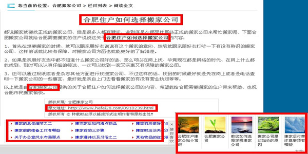 内容页面主要是以“四处一词”的优化方式,大家可以通过源代码查看一下,笔者的文章标题使用了H1标签,而在文章中首次出现文章标题都用了STRONG标签,并且每篇都做好了链向首页主关键词的锚文本链接,这样做可以提高主关键词的内链数量,另外不知道大家有没有注意到笔者的每个文章页面都调用了本文“文章链接”地址,为什么笔者不用锚文本去调用呢,只要大家在百度框中输入“site: inurl:hefei28.com”您就会发现在搜索结果当中会自动将那个“文章链接”高显为红色,这样做的作用是能够提升网站URL的权重,另外在最底部的那个文章调用栏目,本来笔者是不想使用“随机调用”的、但是为了穿插各文章链接,所以笔者让它使用随机显示,这样做的具体效果笔者还在测试中,还有一点值得关注的就是那个“友荐下拉框”、笔者并不知道这个究竟对排名有没有用处,但笔者发现少量搬家公司网站排在百度首页的都用了它,也通过百度搜索友荐这个东西,发现有文章说它能够提升网站排名,所以就抱着试试的态度,有没有效果还得过段时间才清楚。 以上是笔者分析自己的合肥搬家公司网站的一些内容,笔者已经把网站整体优化的要点都毫无保留的曝光出来,相信会给各位网站优化人员一点小小的启发,或许您可以从本文当中学习到表面的站内优化手段,笔者还是那句话、自己动手分析一下才是真正的学到。 本文由合肥搬家公司站长原创提供,转载请保留链接地址、感谢! (责任编辑:admin) |
