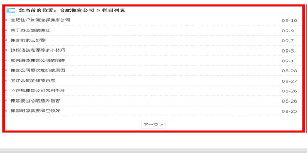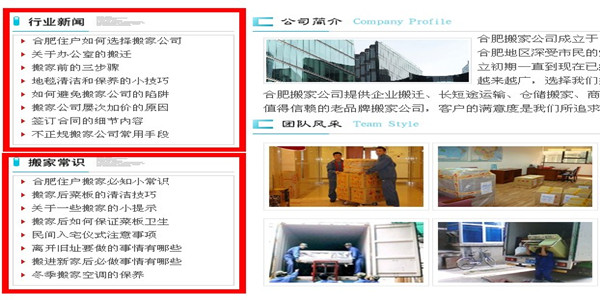 栏目页面主要只有两个,一个是搬家行业新闻、另外一个是搬家行业常识,笔者每天都坚持更新1-2篇文章,文章都是经过深度伪原创的,虽然百度现在提倡原创内容,但笔者毕竟不是开搬家公司的人,对于搬家行业并不了解、所以文章只能够通过其他搬家公司的资源获得,笔者主要做的是首页的那几个主关键词,所以栏目页面并没有过多的做优化,只追求代码的整洁、最大限度的缩短代码,提高页面的打开速度。