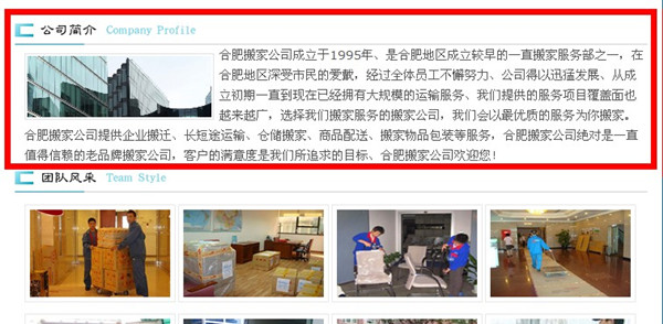首先来分析一下网站首页的优化情况,有很多网站优化人员对于如何控制首页的关键词密度都较为迷茫,大家可以看笔者这个搬家网站的“公司简介”版面,在这里的内容都是笔者用自定义HTML拟写出来的,之前模板是没有这个版面的,而整个首页的关键词密度就是通过这个“公司简介”版面来控制的,这是一种很不错的控制关键词密度的手法。