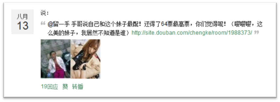 #2 请像豆瓣er一样说话 这里说的像豆瓣er一样说话不算说要模仿豆瓣用户说话,而是你能熟练的运用这里的专业用语,我们不说男人而说蓝人,我们不说上真相而说上杰宝,我们不说屎而说翔,我们也不说亲一个了而说么么嗒。而作为企业官方品牌小站,本身已经被贴上一个一本正经的标签,所以想要跟豆瓣er拉近距离,我们得从日常用语着手。