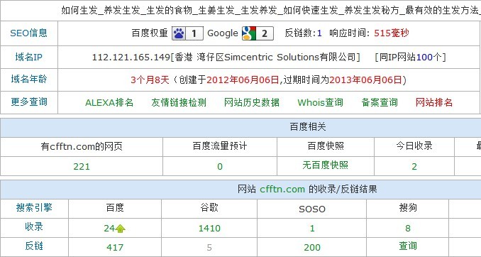沙盒期是指: 新站上线搜索引擎不能判断该站是垃圾站还是正规站,就把它放进沙盒中,我们优化中文站是针对百度搜索引擎来说的在这期间具体的表现就是关键词没有排名,网站出沙盒的时间大约在半个月到两个月之间。 我做的医疗类的生发类产品相关的网站,大家都知道,包括我之前都讲过,医疗类的网站不好优化和管理,我这个站,建站初期就进入的“沙盒”,如果有朋友遇到和我一样的情况,请别着急,更不要放弃你的爱站,你辛辛苦苦的也至少培养了一段时间,不能就这么放弃,我们要把它从“沙盒”中捞出来,今天我要讲的就是实战分析从“沙盒”中挽救的站 老规矩,先基本情况看下,附图一: