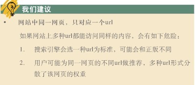 百度搜索引擎优化指南2.0给我们的建议是网站中同一网页,只对应一个url,而这两个页面看似一样并且同时都能访问,但搜索引擎或许会把它定义为两个不同的url,同时,多种url形式会分散了该网页的权重,当然这是在两个页面都收录的情况下;通过观察发现,百度对于这样不同的url,可能一开始两个都会收录,但后面通过调整只会收录其中的一个。如图百度的官方资料: