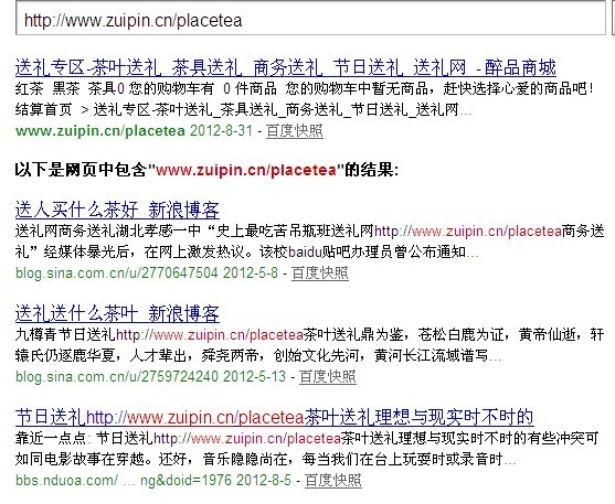 2012百度搜索引擎算法的改变,让欢喜让人忧愁。可喜的是搜索引擎算法改进大大提升了用户体验,seo竞争也越来越公平,一切的作弊和偶然性因素将被慢慢淘汰;可悲的是,众多站长的努力付之东流,付出了太多,却没有得到回报。 算法改进无法避免,即使网站做得再优秀,也必须经常调整,毕竟首页展现的位置很有限,高权重网站很有优势,但同样也得给一些新站机会,因此网站细节的处理对于网站优化是至关重要的,特别是在百度推出站长优化指南和站长平台发布的一些公告后,让很多站长都明白网站的优化的大致方向。 外链的发布和url的处理,看似很简单的问题,但同样给很多站长带来迷惑,比如首页路径带“/”和不带“/”是否有区别,***.com和***.com/在外链发布中如何处理?其实这两者是有一定区别的,我们发现网站网站首页默认的路径都是带“/”,而外链发布中我们也应该带上“/”。因为一些细节处理不当,正当中秋国庆节送礼来临之际,百度调整把收录的页面删除,网站关键词消失了。 这个页面是醉品商城的送礼馆页面,网站栏目页的默认的路径是***.cn/placetea/,在百度搜索发现这个路径并没有被收录:
