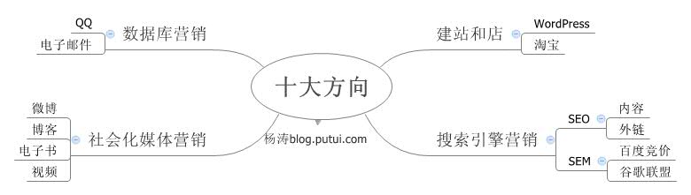 从2002年从事互联网以来,用过的建站程序不下一百个,网站平台的账号差不多一千个,测试过的软件至少上千个,电脑系统几乎是每个月重做还原一次。在笔者杨涛08初在亿玛客网络营销学院做网络营销培训,开发了《网络整合营销实战》的教材讲的是网络整合营销实战二十式,细分的是十几式,粗分的近三十式。本人的研究方向也经历也是从少到多,然后从多再到专与精流程,也从自己及大量学员的实战中看好了以下十个方向。