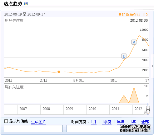 对于草根站长来说,当然不可能像当当网花费大手笔定国旗来吸引用户,但我们可以另寻捷径,最简单的方法就是声明立场,比如更换带有爱国宣言的LOGO,增加醒目的滚动公告,将Banner位置换成相关动态图片等等。这样做不但让用户知道你这个网站是活跃的,还能拉近与用户之间的距离,产生爱国共鸣。 如果你是一位游戏站站长,可以开发一些钓鱼岛小游戏,相信一定会让那些在大街上玩“真人游戏”的热血青年感兴趣的,还能增加用户对网站的好感,这种热门事件还可以带来不少相关流量,搜索“钓鱼岛游戏”可以看到这一指数最高时达到八百多。对于视频网站来说需要提醒的是千万要去掉钓鱼岛事件视频的相关广告,如果打开电脑你迫不及待地想看关于钓鱼岛最近的视频,但漫长的广告将会大大影响你的心情甚至让你产生关闭页面的冲动。此外很多资讯站的朋友老觉得没有什么原创文章可写,那是因为他不会发现,不会从热点事件中发掘,如果以钓鱼岛事件为着眼点,写一篇文章,发表自己的看法也是很容易受到用户欢迎的。