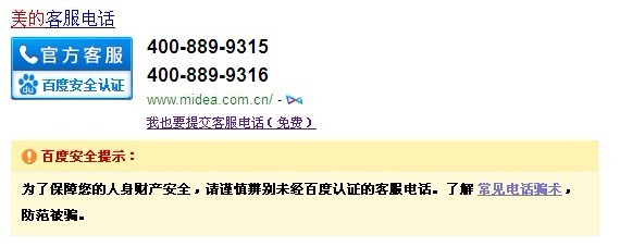 由以上图可见,目前IE浏览器还是占据着主要份额,但奇虎360显然成为百度目前最大的威胁。为此百度为了参与搜索引擎的市场竞争,最近两个月频频作出重大提升用户体验的动作,下面来为大家分析百度的最新改革。 1.为商家提供官方客服电话。百度数据开放平台包括PC端数据提交和移动端数据提交两个入口,站长提交的资源会基于用户需求在PC或移动不同终端的百度搜 索结果页得以展现。但百度官方客服电话的申请具有一定的门槛,要提供相关手续进行审核,主要包括企业营业执照、法人二代身份证或护照、icp备案及注册商 标证,说白了就是要比较正规的企业或者公司才能申请。我们只需要在百度搜索某个公司的品牌关键词,百度就会自动展现一个官方客服电话,如百度搜索“美 的”,就会出现以下结果: