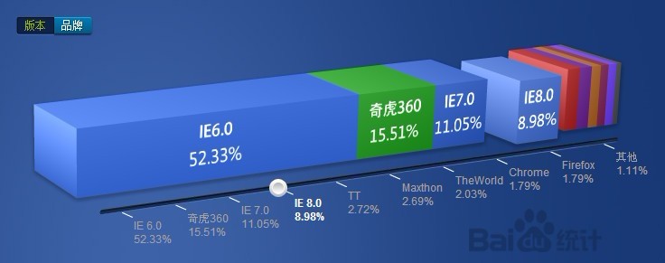 随着2010年5月份谷歌退出中国市场后,百度最近两年可谓是顺风顺水,失去了谷歌这个强大的竞争对手,百度的市场占有率得到大幅度提高,截至2012年 9月,百度市场占有率已经高达72%。如此利好的数据,百度并不安心,因为搜索引擎市场暗藏一些异类,如最新出现的360搜索,让百度感受到潜在的危机意 识,因为360安全浏览器目前已经占据了15%的市场份额。那么我们还是来看百度统计流量研究院的一组数据: