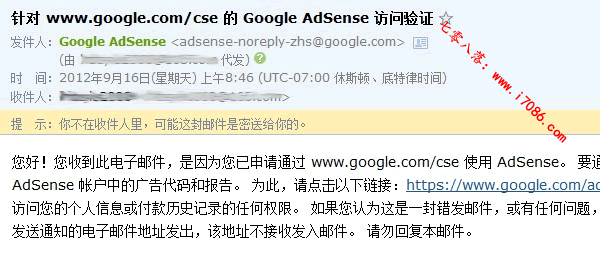 提交后您将收到一封确认邮件,请点击邮件中的链接,授权Google自定义搜索关联AdSense 帐户。