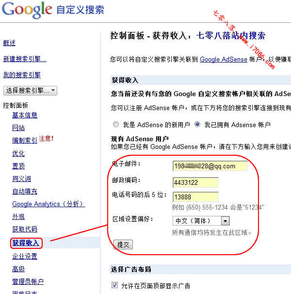 3、选择“获得收入”标签。这里是与 Google AdSense 帐户进行绑定的页面,即在你的搜索页面添加Google AdSense 广告。按要求填写您注册 Google AdSense 时的电子邮件、邮政编码、注册时电话号码的后 5 位数,区域设置偏好选择中文。提交!!