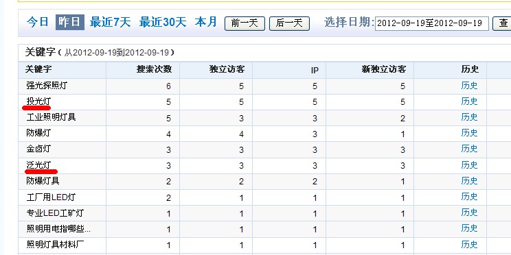 图中,投光灯和泛光灯这两个词的指数接近200,但每天的实际流量却只有5个左右,可见只靠主关键词排名来引入流量,实在是少之又少,所以,我们要从长尾词出发,使万百上千的长尾词获得很好的排名,从而引入流量。对于长尾词的选择,你可以围绕着主关键词去写,想着,你如果要搜这种产品的话,你会怎么搜,这样选择长尾词就会比较精确,而且这种方法来的流量也是不容忽视的,目前我网站,主要流量都是长尾词带来的。见下图。