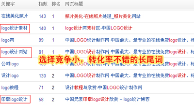 标志设计行业最主要的几个词汇“标志设计”、“LOGO设计”等基本都是7个竞价占满了第一屏。这样一个1000左右的词,做到第一,能获得流量也是非常有限的。今天就说说中国logo设计制作网是如何在百度竞价的围剿中突围的。 1、拓展长尾关键词 虽然主要的关键词都被占据了,但是每个行业还有大部分的长尾词,虽然这些词流量并不是很大,但是数量大,聚集起来的流量是远远不亚于那些主要的关键词的,而且这些词竞价一般比较小甚至没有,能获取的流量反而是客观的。