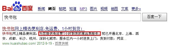 SEO所存在的价值就是从互联网上获取针对地、免费的流量,但多数SEO都处于势单力薄的地位,如果就实力而言,当然是无法与一些大型的站点去竞争,但是 不是中小型类的站点就一无是处了呢?其实并非如此,我们需要的只是从互联网上切到一块属于自己的那份蛋糕即可,这就是中小型的SEO所存在的价值。那么我们应该如何去切呢,这个就是我今天要阐述的内容。 1.制造行业稀缺性。我们做SEO得有这个意识:人无我有,人有我优,人优我绝。试想如果你的网站提供的内容与其它的竞争对手无任何区别,那么用户凭什么会来点击或者购买你的东西呢?就好比在一个寒冷的冬天,街上所有的人都穿羽绒服的时候,这时有一个女生却穿个超短在风中漫步,那么他注定是大众关注的焦点。当然制造行业的差异性的前提是你对这个行业比较了解,这样你才能制造出差异性的内容。那么我们以最近网购的异军-快书包来为大家举例说明。我们来百度搜索“快书包”,请看下图: