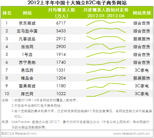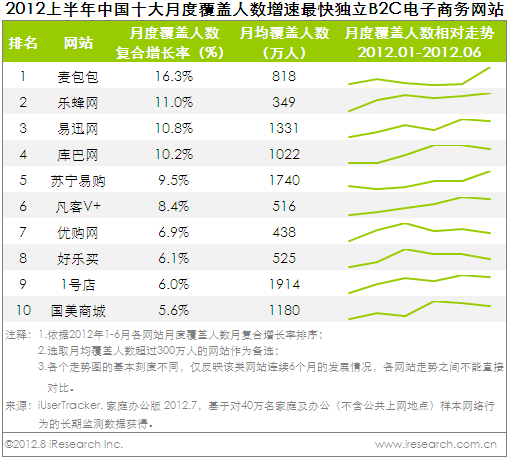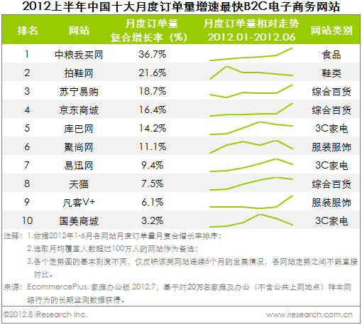 图二是2012上半年中国十大月度订单量增速最快网站排名