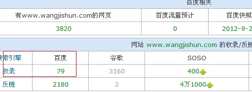 上图是该网站在百度统计的百度索引量查询结果,从数据看出,9月21日-9月23日,百度索引量呈现水平线,百度索引量结果为456。由此可见,百度并没有降低网站的收录量,而我们习惯用站长工具来查询网站的各项数据,这些数据都是通过一系列的命令查询到的,比如:site查询收录量,domain查询网站的外链数据等,这只是一个参考值,真实的数据还是需要靠百度官方给出的方法去查看。 用站长工具查询网站的各项数据为: