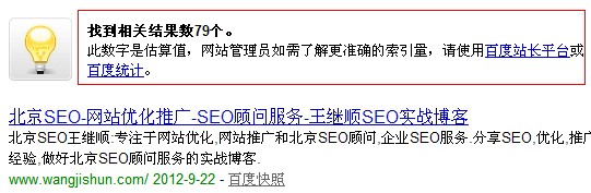 从上面的截图可以看出,使用site命令查询的百度收录量为79个。同时,百度也在告诉大家:此数字是估算值,网站管理员如需了解更准确的索引量,请使用百度站长平台或百度统计。 我们再来看看百度统计中的百度索引量查询结果,看截图: