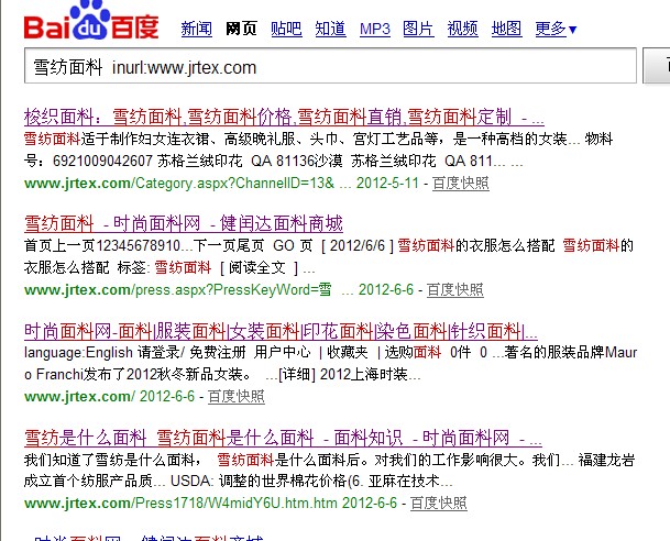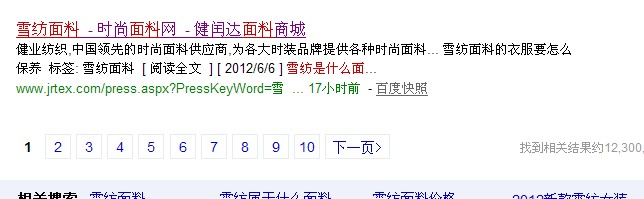 然后我们看到关于“雪纺面料”权重排列,这里有个疑问就是为什么不是排第一的产品页在后面搜索的时候被搜到,我的理解是因为"雪纺面料"文章页里面有"雪纺是什么面料"的关键词,欢迎拍砖 补充: