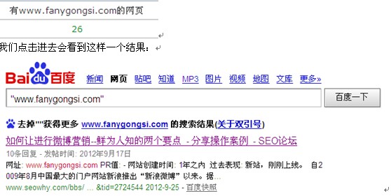 然后大家点击第一个,就是上图的这个标题,会跳转到SEOwhy里面看到一个帖子,这个帖子里面的却有该网址的存在,但却是纯文本形式的,这就不能算作外链,只有可以点击的才会计算权重,才是有效的外链,才会影响排名。 接下来我们在百度中输入domain:***.com,返回的结果中是这样的: