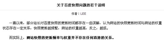 我相信所有的SEOer都有一个共同的目标:网站排名。我们所做的工作,所付出的努力就是为了能让我们的网站排名更好一些。可是在逛论坛、贴吧、或与其他SEOer交流的时候总会发现大家都存在很多误区,总是非常关注那些与排名无关的信息。以至于走偏了方向,努力半天却得不到好的排名。下面几点是我通过观察和交流总结出来的最常见的误区,与大家交流。 1、百度快照。 经常在论坛里看到关于百度快照的帖子,内容无非就是说快照更新慢、快照不更新、快照倒退、快照打不开怎么办,网站是不是降权了,怎么恢复等等。这些站长对百度快照的更新时间都存在一些误解,认为网站的快照更新时间与网站的权重状态存在一定关系,快照更新越频繁,网站的权重越高,排名就越好,反之,越低。其实并不是这样,快照跟权重、排名并没有什么关联。我经常这样跟其他站长说,但是大家都不相信。对此,百度官方还做出了专门的解释。下图是在百度站长社区,lee专门做出的澄清,一些主要内容,具体的大家可以去自己看一下。