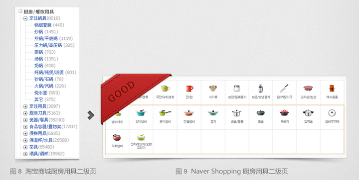 图9 Naver Shopping_厨房用具二级页的分类筛选,采用了图标加文字的形式,同样是查找高压锅,虽然是韩语,但是恰当的使用具象化图标,使用户基本上看懂,可以缩短用户操作时间,让用户更快捷地找到目标链接。对于中高级用户,对网站更加熟悉后,图标就更方便了。