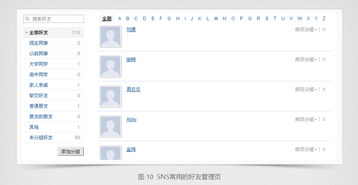 与软件的设计主要针对中间级用户的不同,web界面设计需要针对新手及初级用户。用户在网站上愿意为之所付出的学习成本更低,更加缺乏耐心,则web界面需要更直接,让用户认知过程更短。而文字本身并没有视觉传达功能,恰当的使用图标,把要表述的功能可视化呈现给用户,可以缩短用户操作时间,往往效果更好。但也要根据用户效率,否则会成为鸡肋。 控件元素四:列表视图 列表视图(List View)是一个显示项目集合的扩展列表框控件,用于通过单选或多选的方式,查看并操作一个数据对象集合。 图10 SNS常用的好友分组和管理,采用列表的方式,列表目录清晰,但用户对其的选择管理成本稍大,特别是对于批量管理复杂。