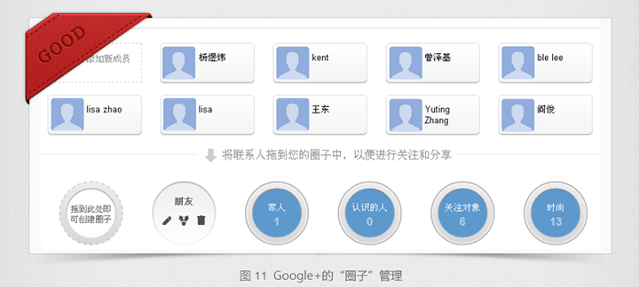 图11 google+“圈子”,查看更直观,批量管理操作也更简单,通过拖拽方式对用户分组,强调对好友的少层级管理,保证页面简洁,让体验变得有趣而可爱,更符合用户的心理模型。