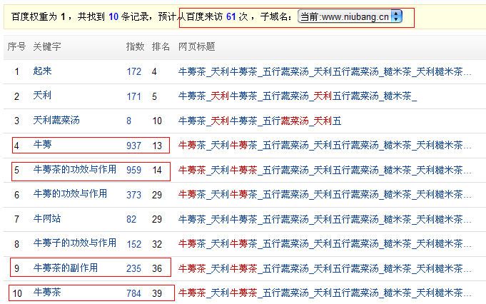 其实做企业站没有大家想象中的那么难,最重要的还是全靠分析网站来实行。只要分析到网站缺哪些,多哪些,网站架构到底有没有被优化等这些方向去做,笔者相信,只要努力就会得到回报。笔者坚信这点,三个月来我做了很多,每天起早贪黑的为度娘服务,晚上给度娘洗脚,哄度娘睡觉。早上早起给度娘做好饭,让度娘不饿肚子,到最后度娘还是喜欢上了笔者。下面就把我的经验具体给大家说下。 一:分析自己的网站以及竞争对手的网站 做站最重要的就是要学会分析自己的网站和竞争对手的网站,不仅是你会分析,对方也会分析,所以要取长补短,把别人的缺点来当作自己的缺点,把别人的优点也当作自己的缺点。首先分析自己的网站,笔者做的是食品类型的网站,网站主要做的是牛蒡茶,五行蔬菜汤,糙米茶等食品,所以仔细分析下内链和外链的内容是否有针对性,那么这几个食品的名称笔者作为网站的关键字,长尾关键字而是食品的功效与作用以及价格和副作用。至于主机和域名什么的那些笔者暂不提,在购买主机的时候一切都打理好。分析完自己的网站后然后开始分析竞争对手的网站,首先要看他们的流量是从哪些关键字获得的,然后看他们的外链是发布哪些平台的。做企业站最重要的就是外链针对性,我这三个月一直是采用长尾来控制流量的,发现效果还是非常不错的。致使至今百度流量统计是61。