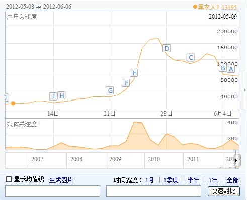 优酷网2011电影页面URL 2、对于长尾关键词的优化 电影网站要想获得更多的搜索流量,其中最重要的一点就是抓住一些新出来的电影长尾词或者更多一些,抓住一些比较知名的电影明星的电影关键词,对应的去做好SEO设置,并通过自己的网站资源,做好这些关键词的排名,那么网站的流量提升可能会更多。 例如“黑衣人3”是一部比较不错的美国大片,在优酷的电影频道有推荐影片的最新资讯,应该来说这个页面的权重是相当不错的,但是当我们在百度搜索“黑衣人3”却发现优酷的网页居然排在第二页第一个,这相对来说损失掉了这个关键词的一些流量。查看百度指数,这个词的每日搜索量大概在80000左右: