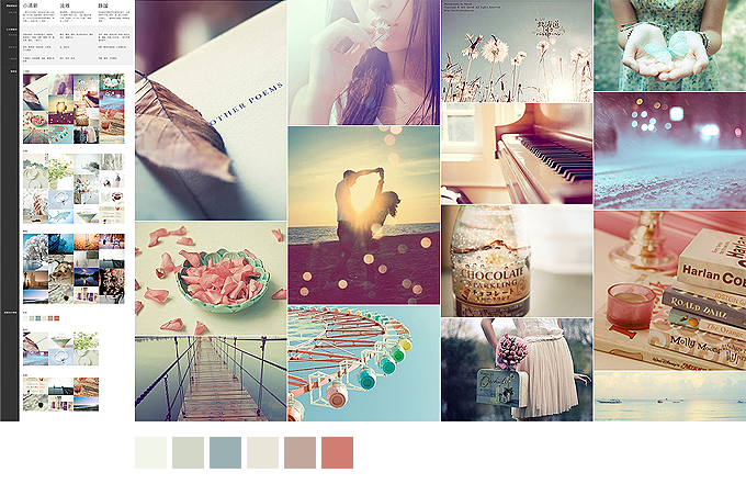 其次,除了上面提到的常见元素以外,色彩当然也是很重要的一方面。但是从“小清新”的字面意思理解,她的用色完全就是淡淡的很清爽的那一类色系吗?我通过她以及其他2个衍生的关键词做了一下情绪版的分析,并且通过Colorhunter这个站点提取了关键色彩并做了微调,在其中寻找到色彩上的变化。
