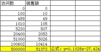 正态概率图一般用于检查一组数据是否服从正态分布,是实际数值和正态分布数据之间的函数关系散点图,如果这组数值服从正态分布,正态概率图将是一条直线。回归分析不一定得符合正态分布,这里只是仅仅把它描绘出来而已。 以上数据表格和图表都说明公式y=0.01028x-27.424是一个值得信赖的预测曲线,假设搞活动时流量有50万访问数的话,那么预测销售将是51373,如下图所示: