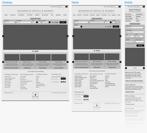 查看线上demo 当浏览器宽度变小时,左右两栏的宽度都有缩小,左边的banner图片和视频也相应缩小,右边的头像列表由一排4个变为一排两个。 当浏览器宽度进一步变小后,页面由两栏结构变为一栏结构,部分内容的尺寸进一步缩小,搜索区域也从导航里挪到了导航外。 响应式页面的设计流程 第一步:确定需要兼容的设备类型、屏幕尺寸 通过用户研究,了解用户使用的设备分布情况,确定需要兼容的设备类型、屏幕尺寸。 设备类型:包括移动设备(手机、平板)和pc。对于移动设备,设计和实现的时候注意增加手势的功能。 屏幕尺寸:包括各种手机屏幕的尺寸(包括横向和竖向)、各种平板的尺寸(包括横向和竖向)、普通电脑屏幕和宽屏。 需要考虑的问题: 某个页面进行响应式设计时其适用的尺寸范围是哪些?比如,1688搜索结果页面,跨度可以从手机到宽屏,而1688首页,由于结构过于复杂,想直接迁移到手机上,不太现实,不如直接设计一个手机版的首页。 结合用户需求和实现成本,对适用的尺寸进行取舍。比如一些功能操作的页面,用户一般没有在移动端进行操作的需求,没有必要进行响应式设计。 第二步:制作线框原型 针对确定下来的几个尺寸分别制作不同的线框原型,需要考虑清楚不同尺寸下,页面的布局如何变化,内容尺寸如何缩放,功能、内容的删减,甚至针对特殊的环境作特殊化的设计等。这个过程需要设计师和前端开发人员保持密切的沟通。